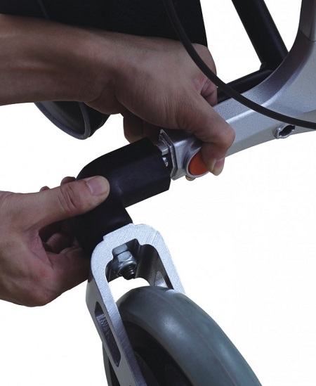 Andador de plegado lateral para uso exeterior con Ruedas delanteras de 25 cm y traseras de 20 cm. Asiento acolchado. Bolsa Porta objetos. Ruedas delanteras plegables y traseras desmontables para trasnporte.