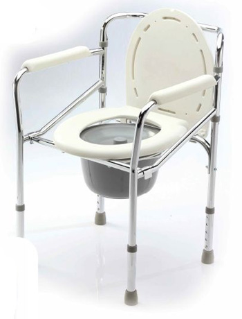 Estructura de acero con apoyabrazos y respaldo Terminación: cromado Asiento y tapa rebatibles y desmontables Incluye bacinilla plástica con tapa y manija Regatones: 25mm gris