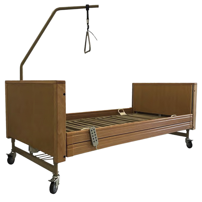 Cabecero y piecero construido en madera maciza y barandas laterales en aluminio coloreadas en madera. Regulable en altura y con ruedas de 10 cm con frenos individuales.