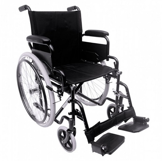 Silla de Ruedas con estructura en acero plegable lateralmente, ruedas traseras de 60 cm. con cubiertas macizas simil neumaticas y delanteras de 20 cm macizas. Apoya brazos tipo escritorio rebatibles y apoya pies rebatibles y desmontables. Sosten para pantorrilas. Tapizados en cordura.