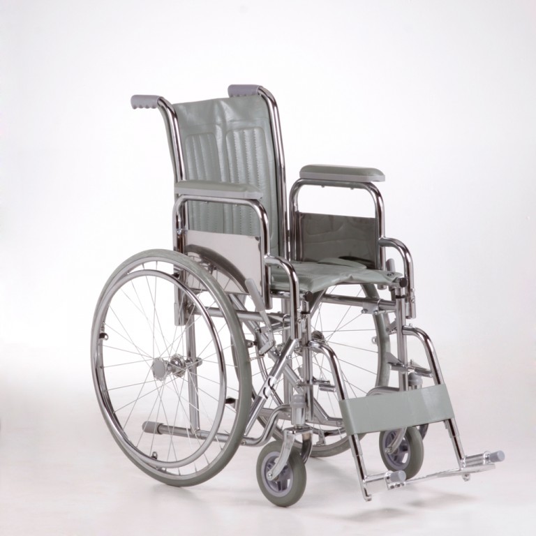 Estructura en acero. Respaldo reclinable. Apoya brazos rebatibles. Apoya pies desmontables, rebatibles y elevables. Ruedas delanteras de 20 cm macizas. Ruedas traseras de 60 cm macizas. Rueda antivuelco. Peso maximo del paciente 100 kg