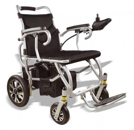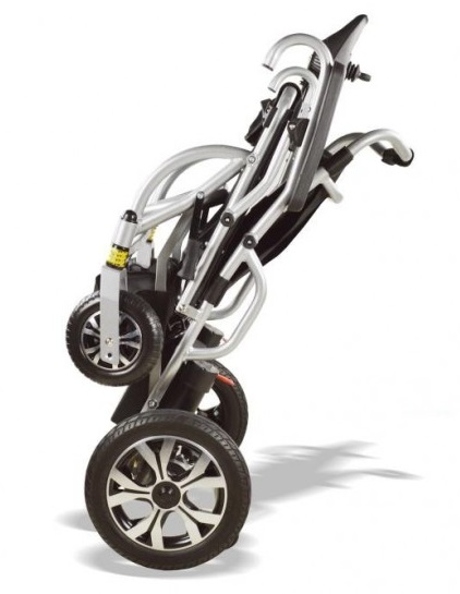 Silla de Ruedas Motorizada contruida en aluminio de plegado facil. Ruedas traseras neumaticas de 32 cm y ruedas delanteras macizas de 17.5 cm. Suspension delantera. Bateria de litio de 12 AH. Autonomia 12 KM. Peso de transporte 18 kg.
